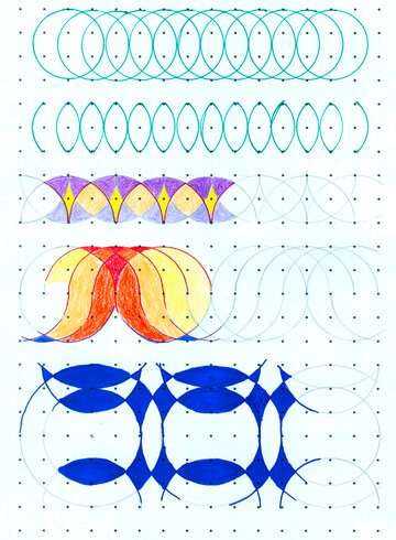 Hier können sich die Kinder auf die Handhabung des Zirkels konzentrieren und die Kreismittelpunkte nach einem gleichbleibenden Abzählmuster aus den Rasterpunkten auswählen. So entstehen verblüffende, schwierig wirkende Muster, die meine Schülerinnen und Schüler immer wieder überraschen.