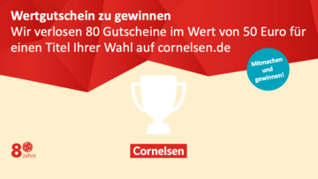 Bis zum 30. Juni 2026 verlosen wir 80 Wertgutscheine im Wert von jeweils 50 Euro. Diese sind einzulösen unter cornelsen.de/shop. Bitte berücksichtigen Sie, dass für manche Titel eine Lehrkräfte-Authentifizierung erforderlich ist.