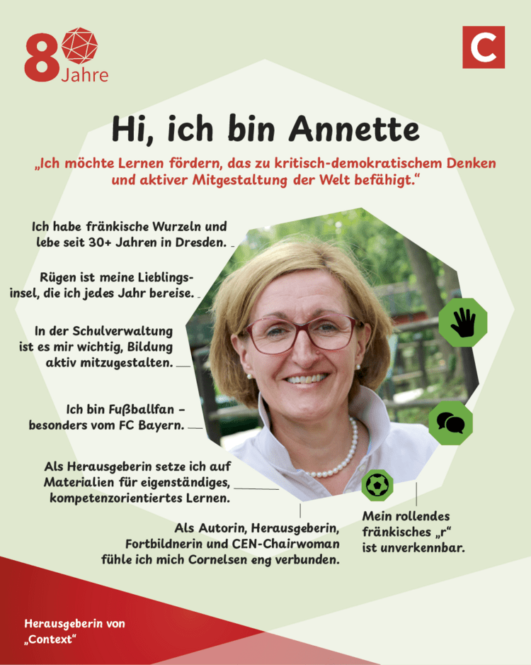 Seit acht Jahrzehnten öffnen wir Türen zu Wissen und Bildung. Zum Jubiläum laden wir Sie ein, neue Perspektiven zu erkunden: Der bewegliche 80-seitige Polygon steht für die vielen Facetten unserer Lernwelten. Drehen, entdecken und erleben, wie Cornelsen seit 1946 Bildung gestaltet.