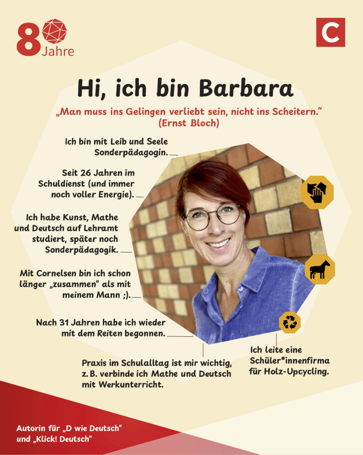 Seit acht Jahrzehnten öffnen wir Türen zu Wissen und Bildung. Zum Jubiläum laden wir Sie ein, neue Perspektiven zu erkunden: Der bewegliche 80-seitige Polygon steht für die vielen Facetten unserer Lernwelten. Drehen, entdecken und erleben, wie Cornelsen seit 1946 Bildung gestaltet.