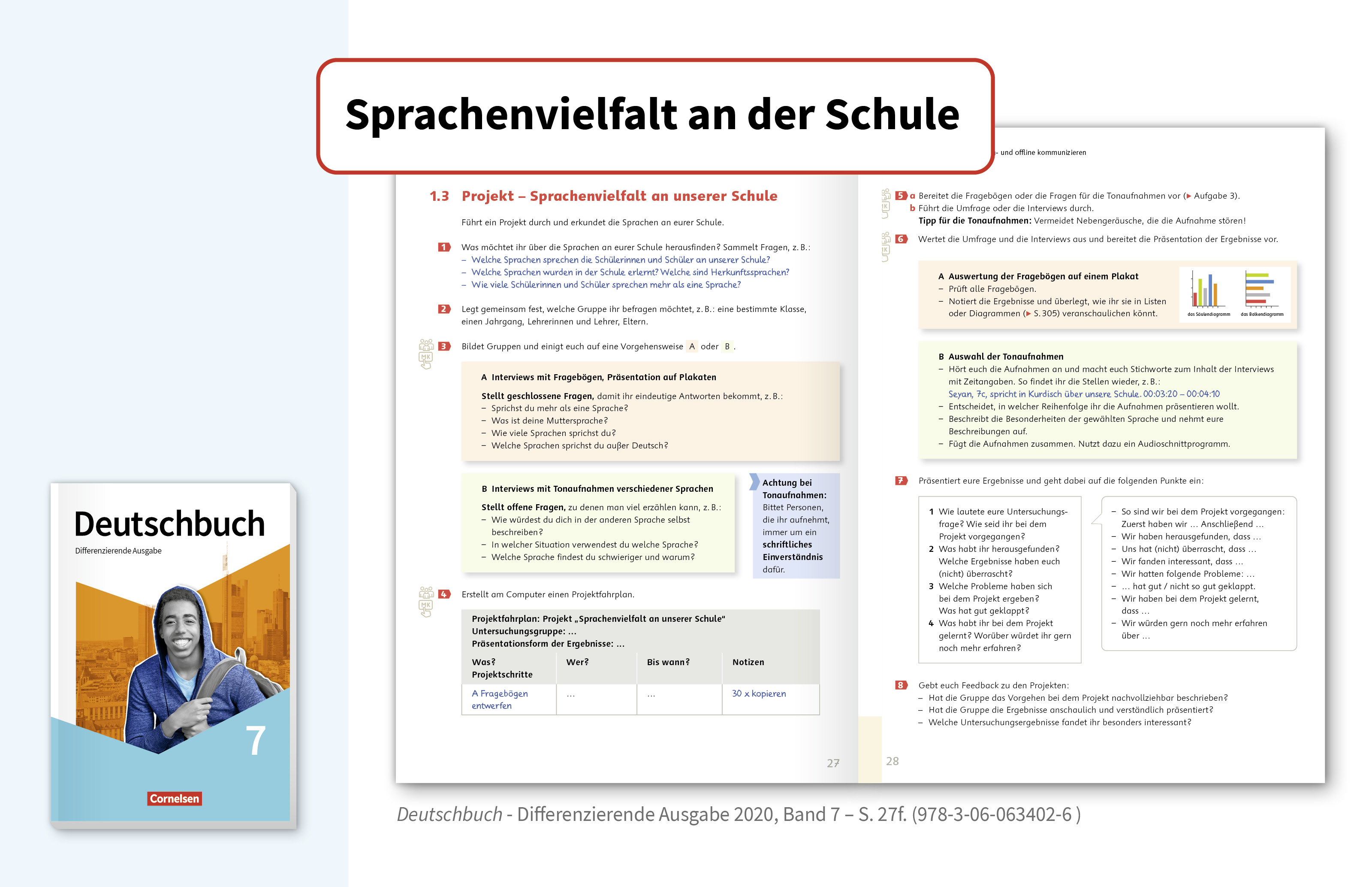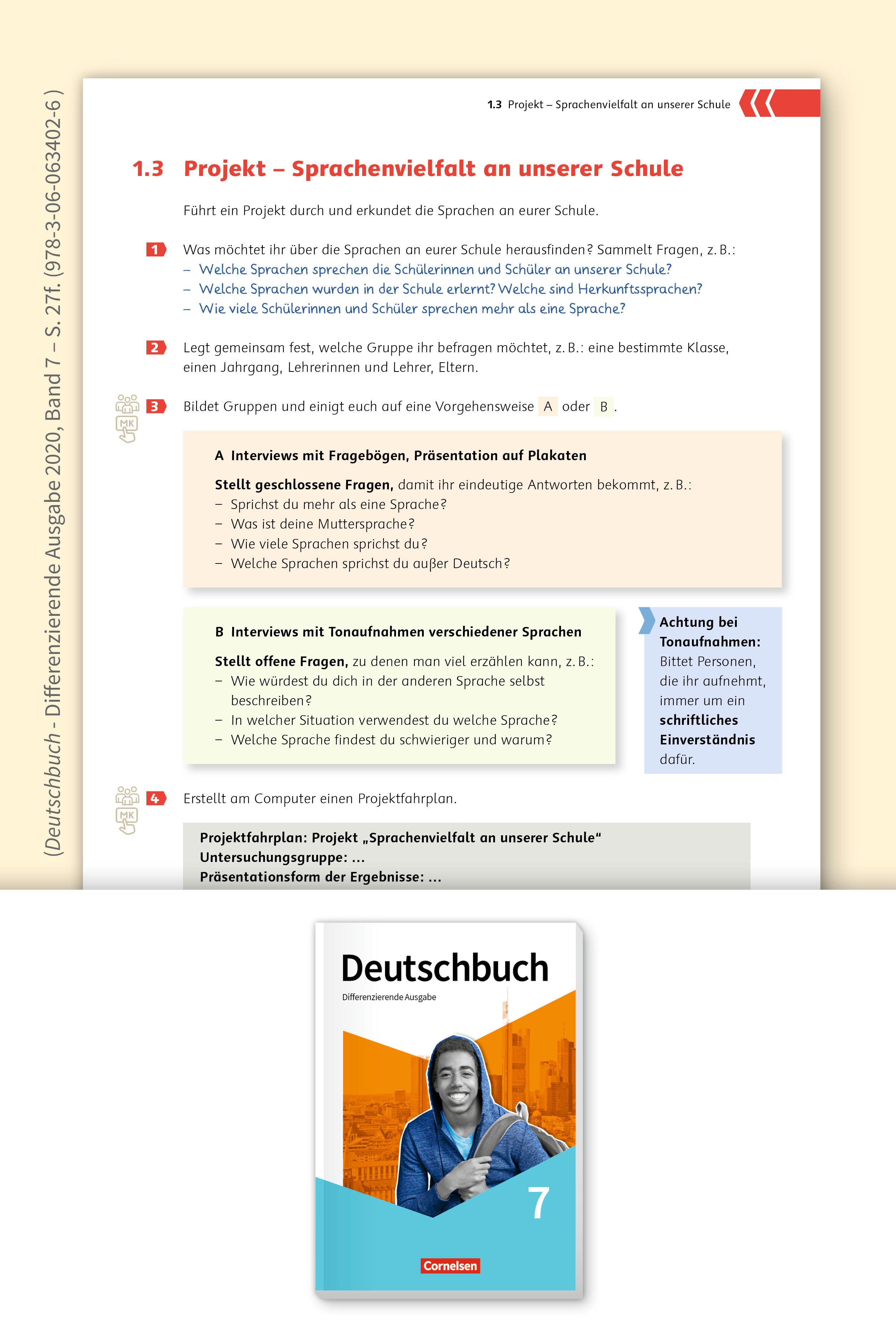 Schülerinnen und Schüler erkunden in Deutschbuch – Differenzierende Ausgabe mit Hilfe von Interviews und Fragebögen die Sprachen, die an ihrer Schule gesprochen werden.