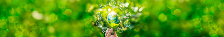 Hand hält kleine Weltkugel, umgeben von Recycling-Symbolen auf grünem Hintergrund.