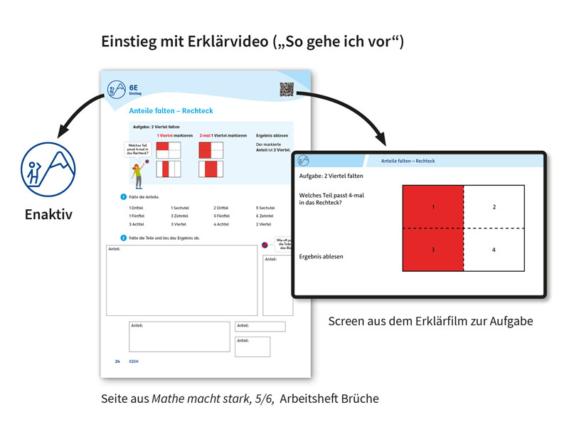 Mit dem QR-Code auf der Seite gelangen die Lernenden jeweils direkt zu einem Erklärvideo. Konkrete Handlungsanweisungen und detaillierte Beschreibungen erläutern den Aufgabenverlauf. Selbstständiges Lernen im eigenen Tempo gelingt allen sicher.