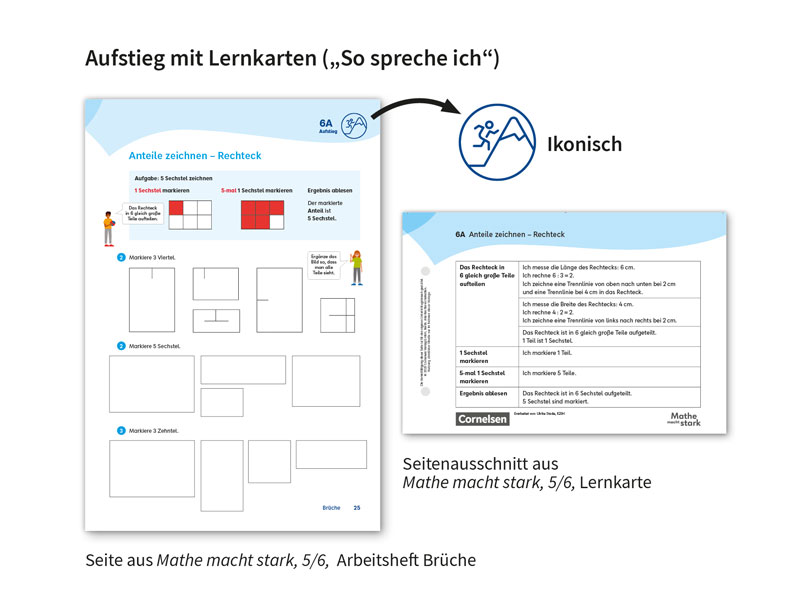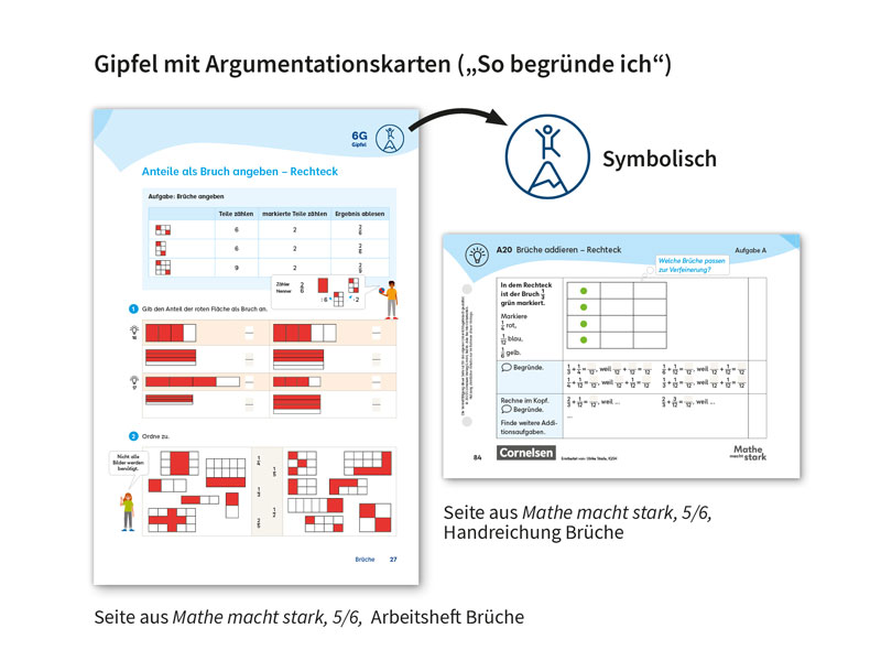 Passend zum Arbeitsheft liefern Argumentationskarten (in den Handreichungen) den rechnerischen Lösungsweg zusammengefasst und übersichtlich dargestellt. Im Beispiel: Anteile als Bruch angeben.
