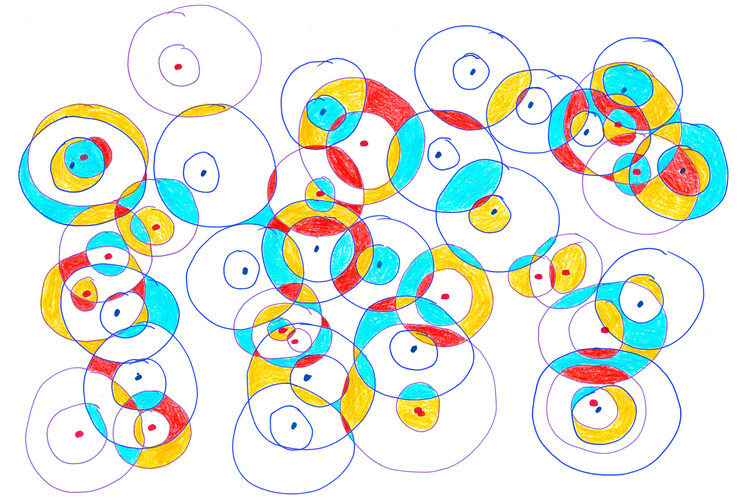 Je zwei Kinder erarbeiten ein gemeinsames Bild aus Kreisen. Zuerst setzen beide Kinder abwechselnd und mit geschlossenen Augen eine vorgegebene Anzahl von Punkten auf das leere Blatt. Das sind die Tropfen, die auf das Wasser treffen. Freihändig zeichnen sie um jeden Punkt zwei beliebig große Kreise und leiten dabei die Eigenschaften eines perfekten Kreises ab: Die Kreislinie muss immer den gleichen Abstand zum Mittelpunkt haben. Das ist nicht einfach zu zeichnen, denn die Kreise überschneiden sich.