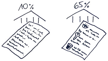 80 Prozent der menschlichen Wahrnehmung kommen auf visuellem Wege zustande. Indem wir uns ein Objekt vorstellen, es zeichnen, dann anschauen und mit dem Inhalt abgleichen, erhöht sich der Merkeffekt um ein Vielfaches. So beschreibt der Picture Superiority Effect, dass sich der Mensch eher an gezeichnete als geschriebene oder nur gehörte Inhalte erinnert. Ungefähr 90 Prozent vergisst man nach drei Tagen, wenn der Text nur gelesen wurde. Jedoch erinnert man sich an 65 Prozent, wenn der geschriebene Text mit Bildern kombiniert war. Es steht also 10 Prozent zu 65 Prozent.