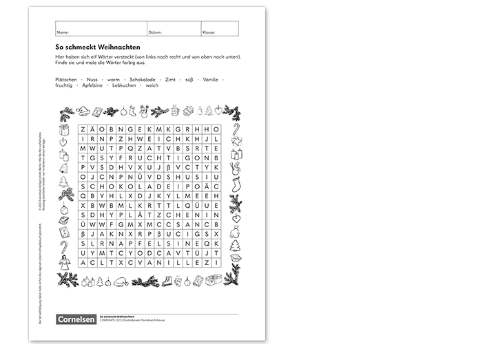 Süß wie Plätzchen und fruchtig wie eine Apfelsine. Diese Arbeitsblätter widmen sich spielerisch dem Geschmack von Weihnachten. Es warten zwei Suchsel und ein Arbeitsblatt zum freien Schreiben und Gestalten auf Ihre Klasse.