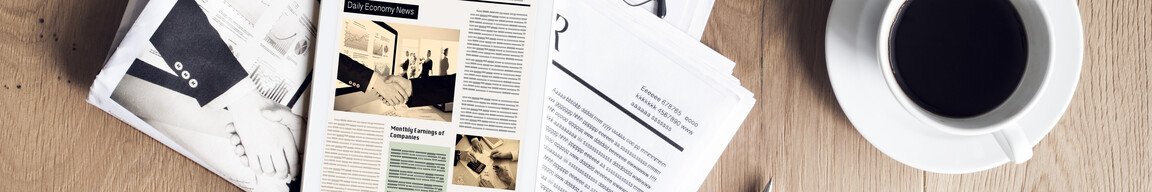 Zeitungen, Tablet, Brille, Stift und Kaffee auf Holztisch aus Vogelperspektive.