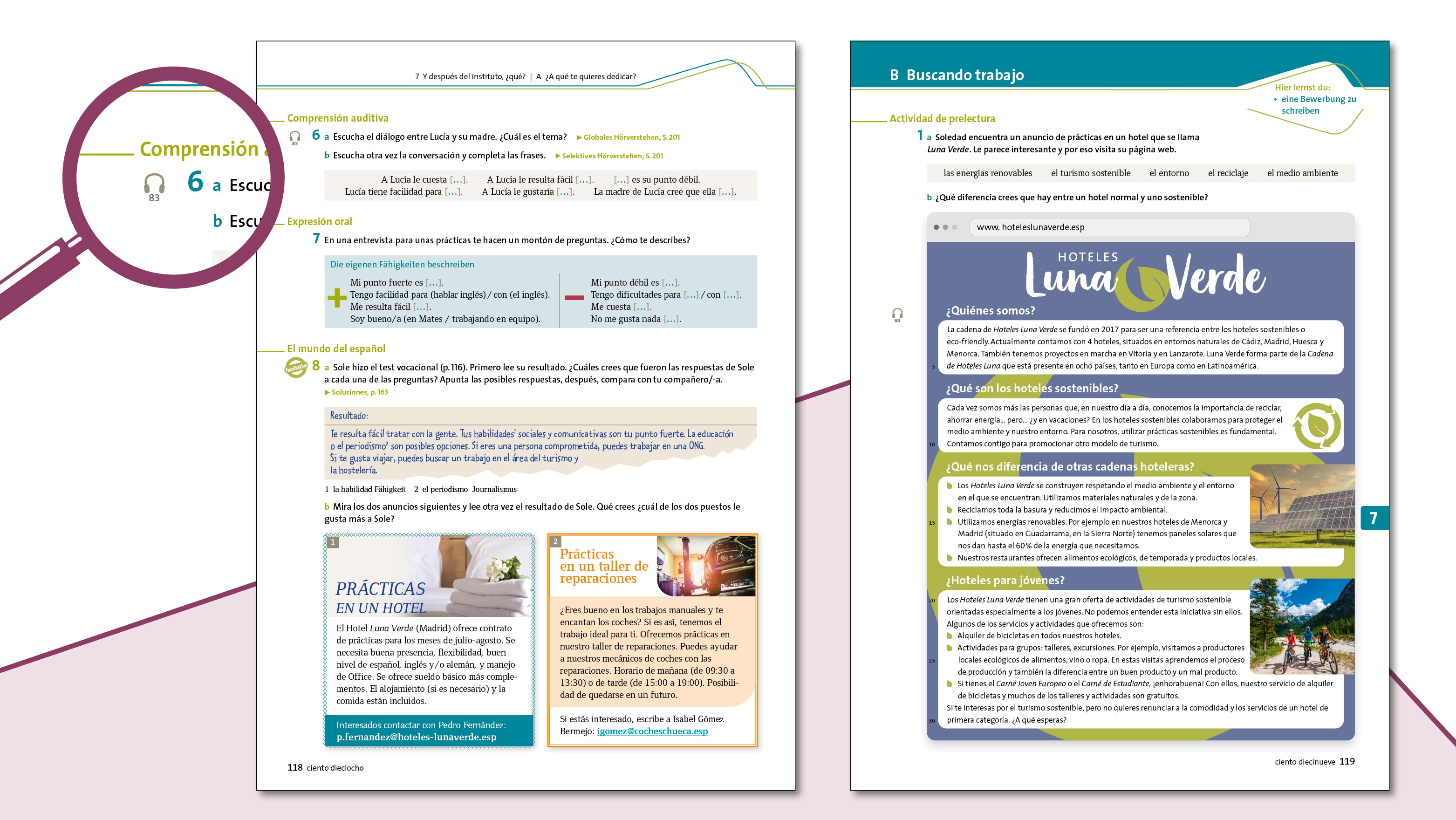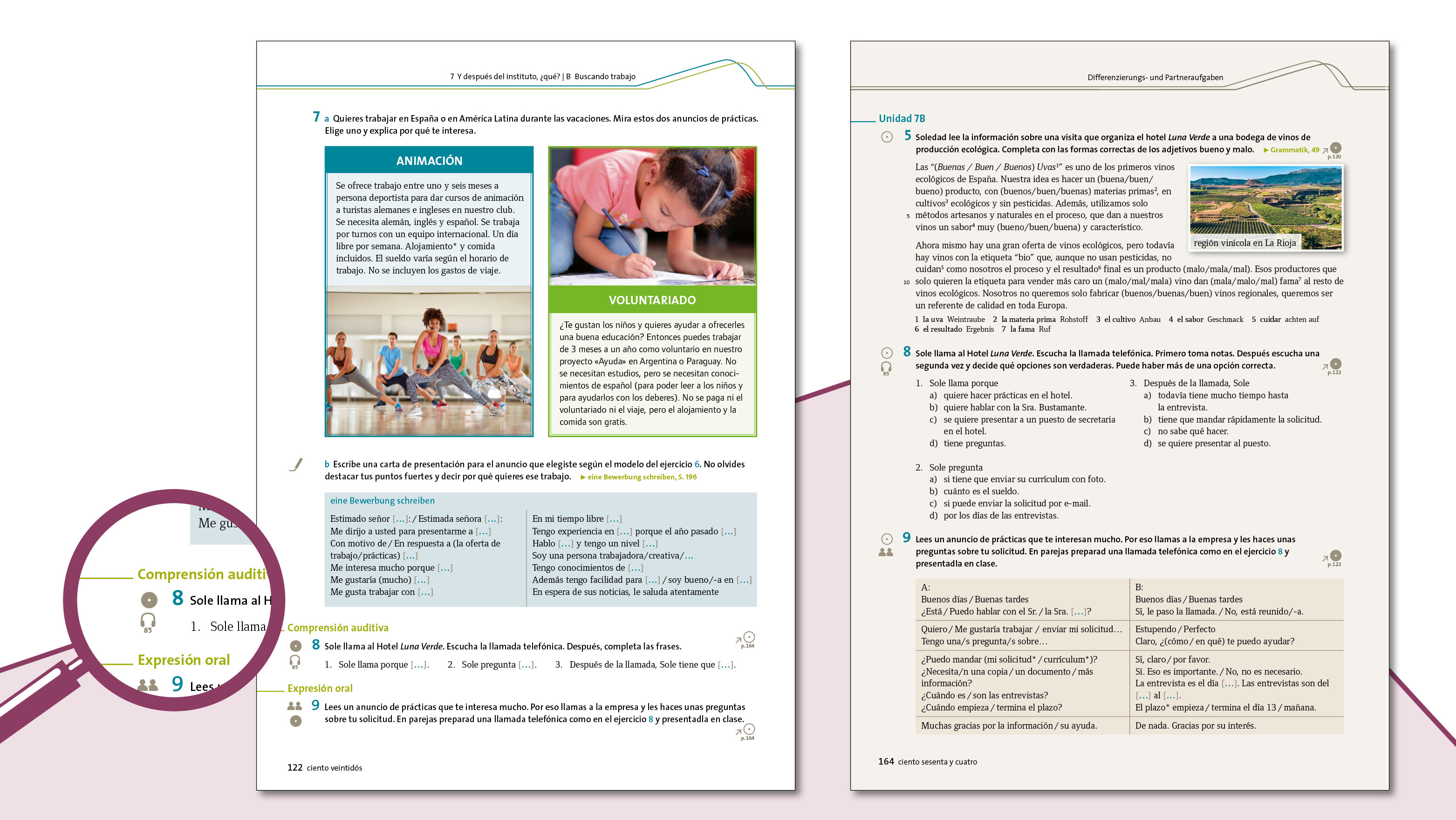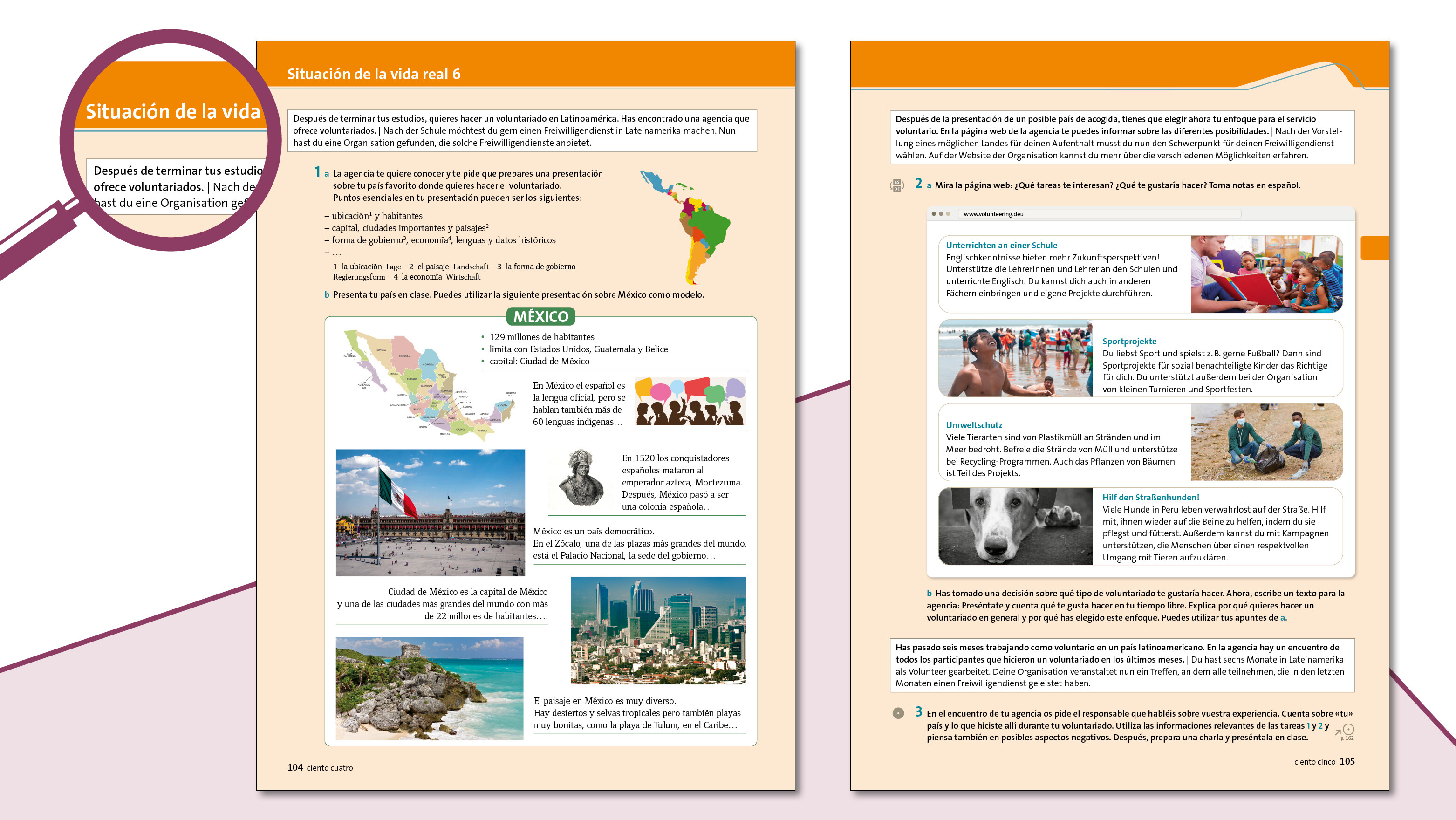 - Situaciones de la vida real: Nach jeder Unidad haben Ihre Schülerinnen und Schüler die Möglichkeit, das Gelernte in einer Handlungssituation in beruflichen oder kulturellen Kontexten anzuwenden. Dabei lernen sie keinen neuen Stoff, sondern üben die in der Unidad erworbenen sprachlichen Mittel.