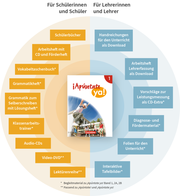 Unsere Reihe ¡Apúntate ya! hat alles, was Sie für den erfolgreichen Spanischunterricht in heterogenen Klassen brauchen. Für den Lernstoff, den ¡Apúntate! in zwei Jahren vermittelt, haben Schüler/-innen, die mit ¡Apúntate ya! lernen, drei Jahre Zeit. Eine flache Progression, zusätzliche Förder- und Differenzierungsangebote sowie handlungsorientierte Lernaufgaben führen mit kleinen Schritten zum großen Lernerfolg.