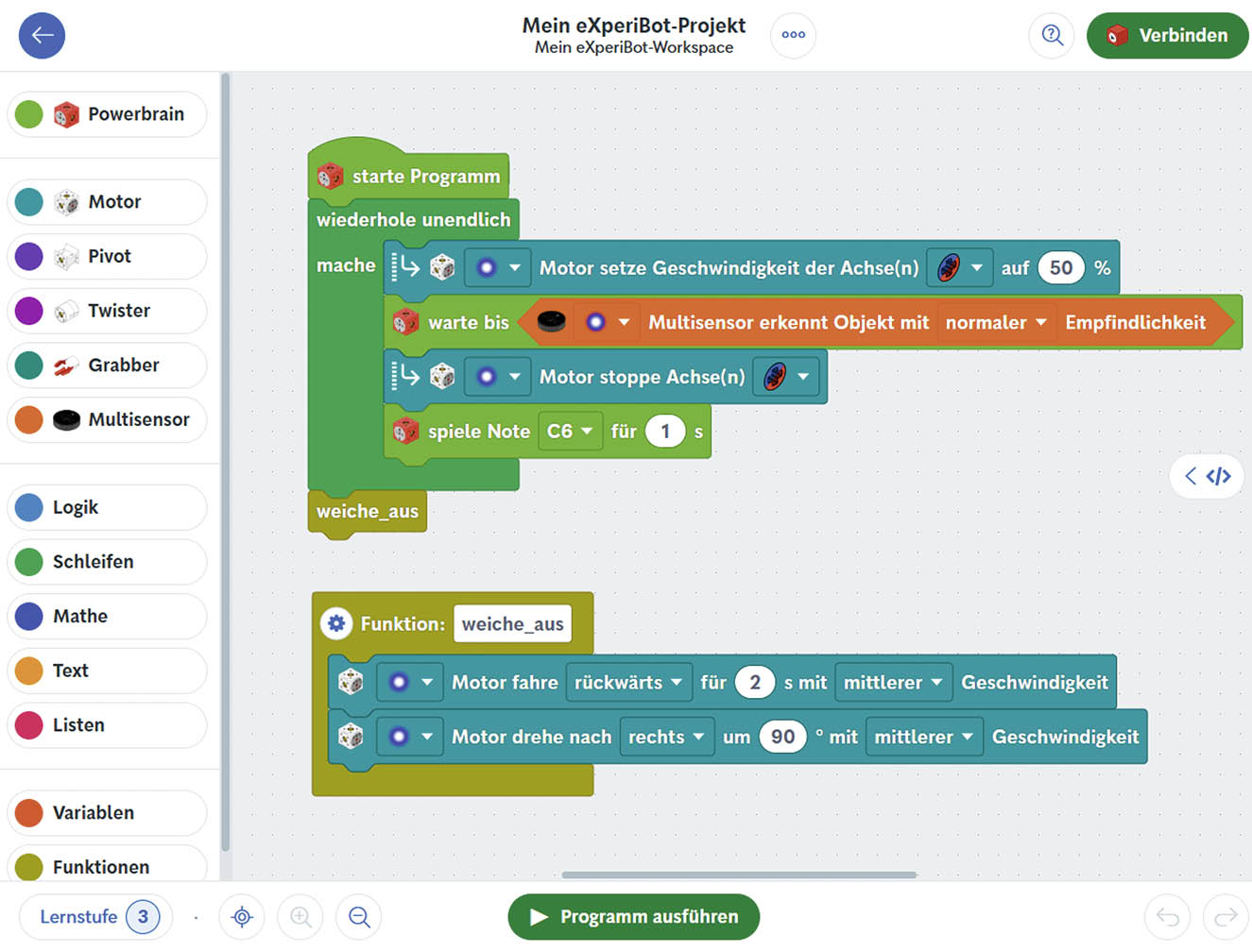 Die praxisorientierten Materialien direkt in der App machen den eXperiBot zu einem echten Lernroboter. Das zeigt sich auch in der grafischen Programmierung mit der eXperiBot Blockly App. Wie beim Lernroboter selbst gilt auch hier das Prinzip "intuitiv und praxistauglich".