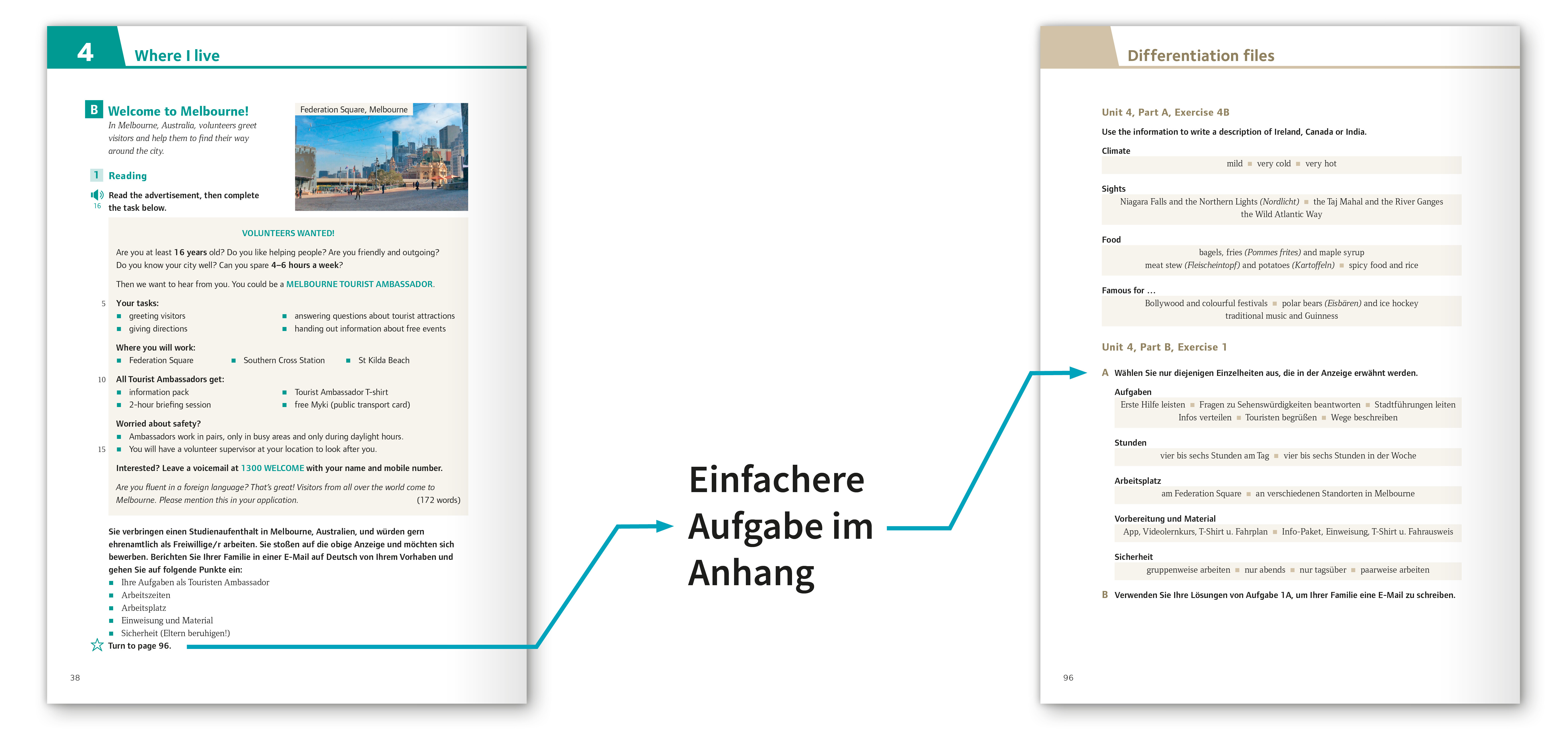 Aufgaben zur Differenzierung unterstützen das individuelle Lernen. In Do it! Starter finden Sie schwierigere Aufgaben im Anhang. Do it! A1/A2 unterstützt mit leichteren Aufgaben und sprachlichen Hilfen. In Do it! Advanced finden Sie sowohl leichtere Aufgaben als auch zusätzliche Herausforderungen.