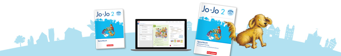 Jo-Jo 3 Schulbuch, Laptop mit Lerninhalten und Hund auf blauem Stadthintergrund.