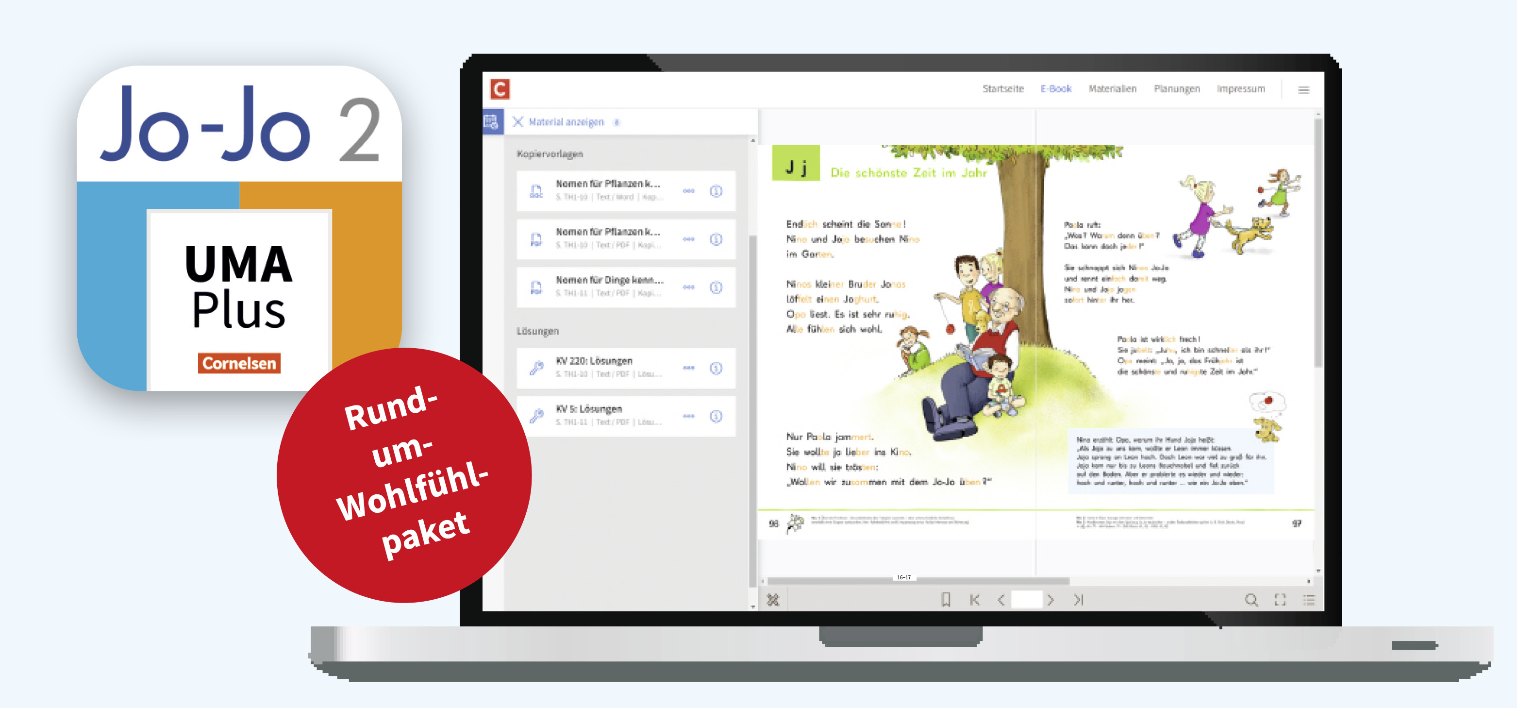 Der Unterrichtsmanager Plus umfasst das Schulbuch als E-Book, die digitalen Medien und alle wichtigen Materialien zum Lehrwerk. Unser Tipp: Bei Jo-Jo gibt es ein besonders großes Materialpaket mit den E-Books und den Materialien zum Jo-Jo Sprach- und Lesebuch.
