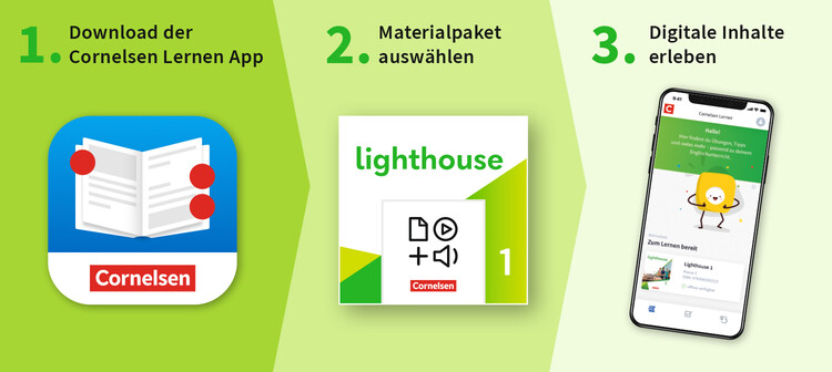 Einfach die kostenlose Cornelsen Lernen App herunterladen – im App Store oder bei Google Play. App öffnen (wahlweise mit Registrierung oder NEU: ohne Registrierung) und darin das digitale Materialpaket zum Lehrwerk auswählen, Seitenzahl eingeben und die zusätzlichen Inhalte entdecken.