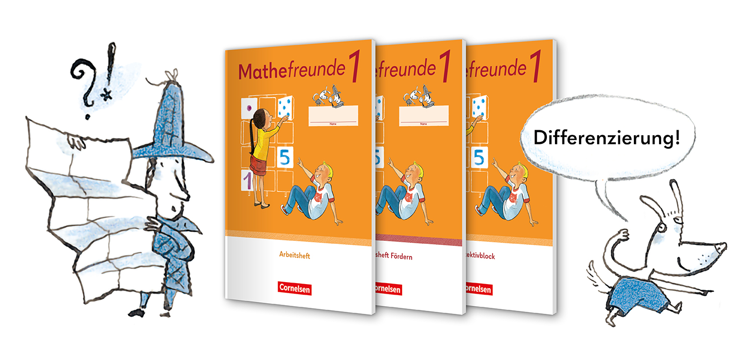Drei Mathefreunde 1 Bücher, Hund und Detektivzeichnung, Sprechblase: "Differenzierung!"