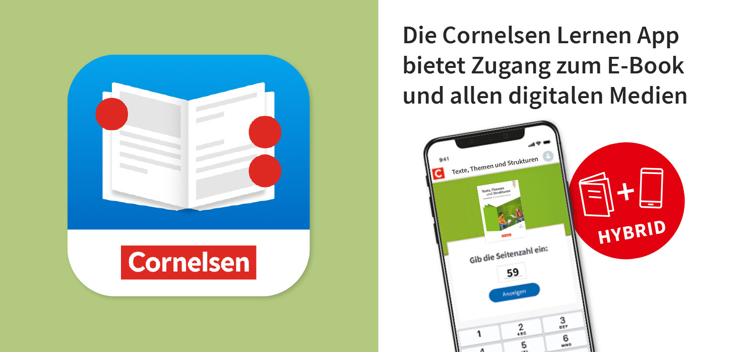 Mit der Cornelsen Lernen App haben Sie und Ihre Lernenden alles, was Sie für Ihren Unterricht brauchen, an einem Ort: Sicher, flexibel und einfach nutzbar. Sie erhalten Zugang zum E-Book und den digitalen Medien zu Texte, Themen und Strukturen sowie zu vielen hilfreichen Funktionen.