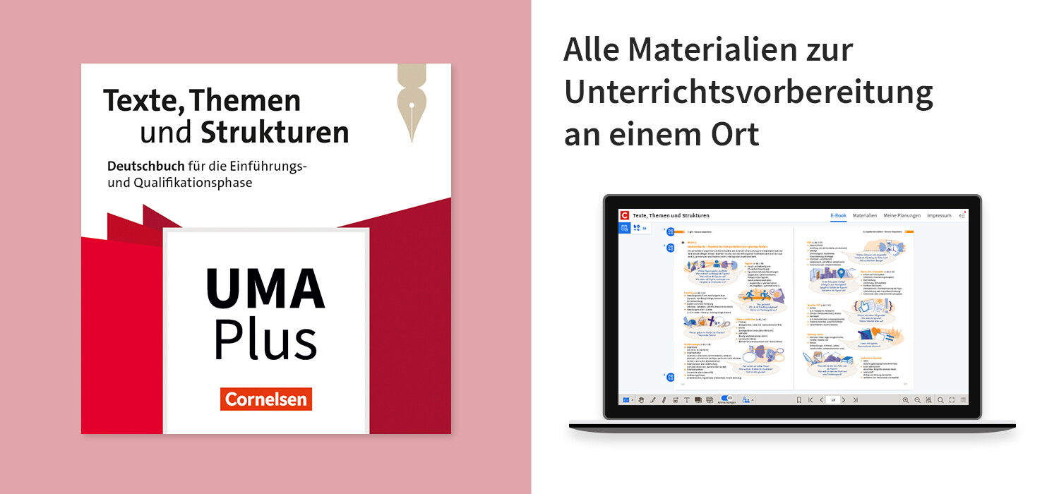 Links: Buch "UMA Plus", Cornelsen. Rechts: Laptop mit geöffneter Unterrichtsmaterialien-Seite.