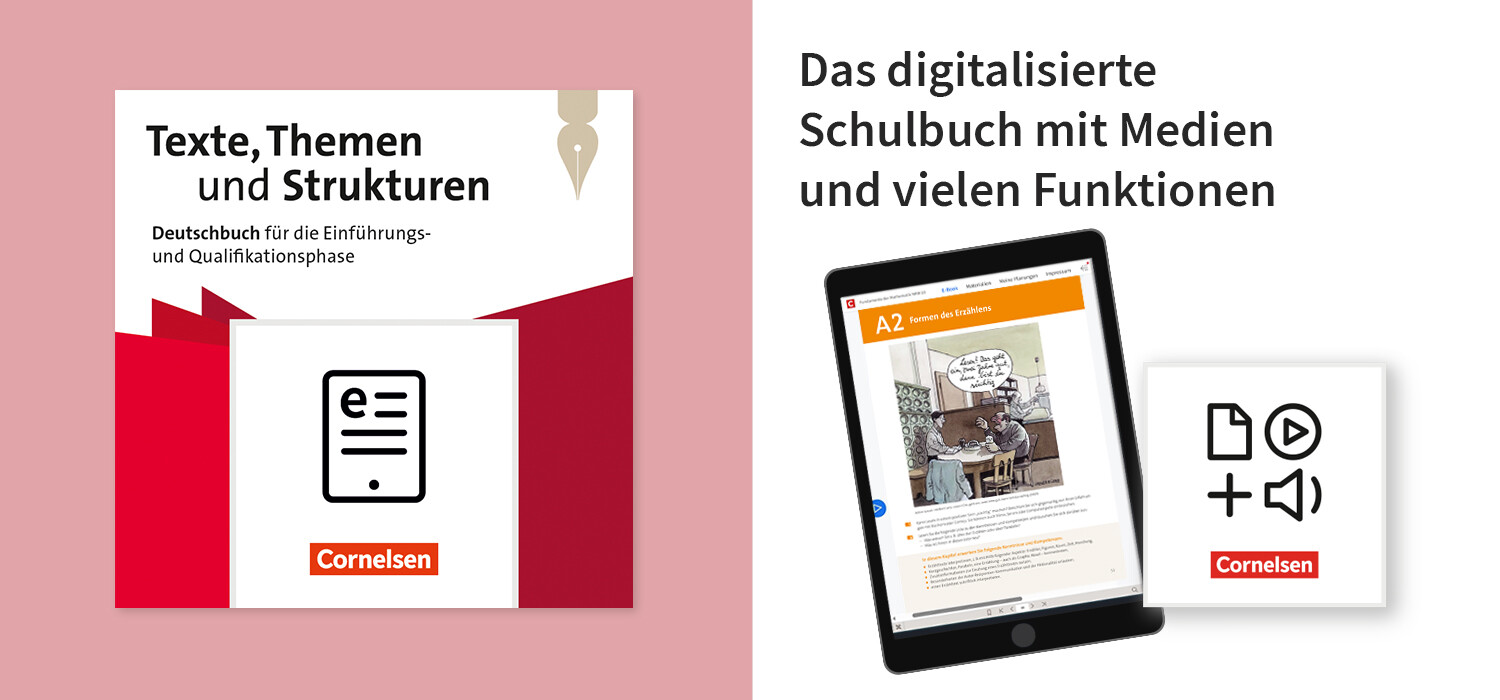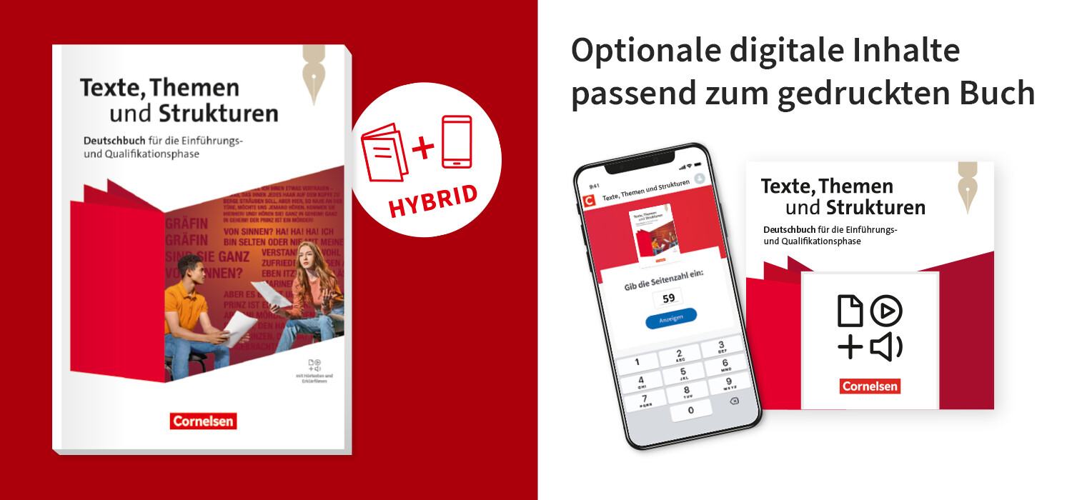 Buchcover und digitale Inhalte von "Texte, Themen und Strukturen" von Cornelsen.