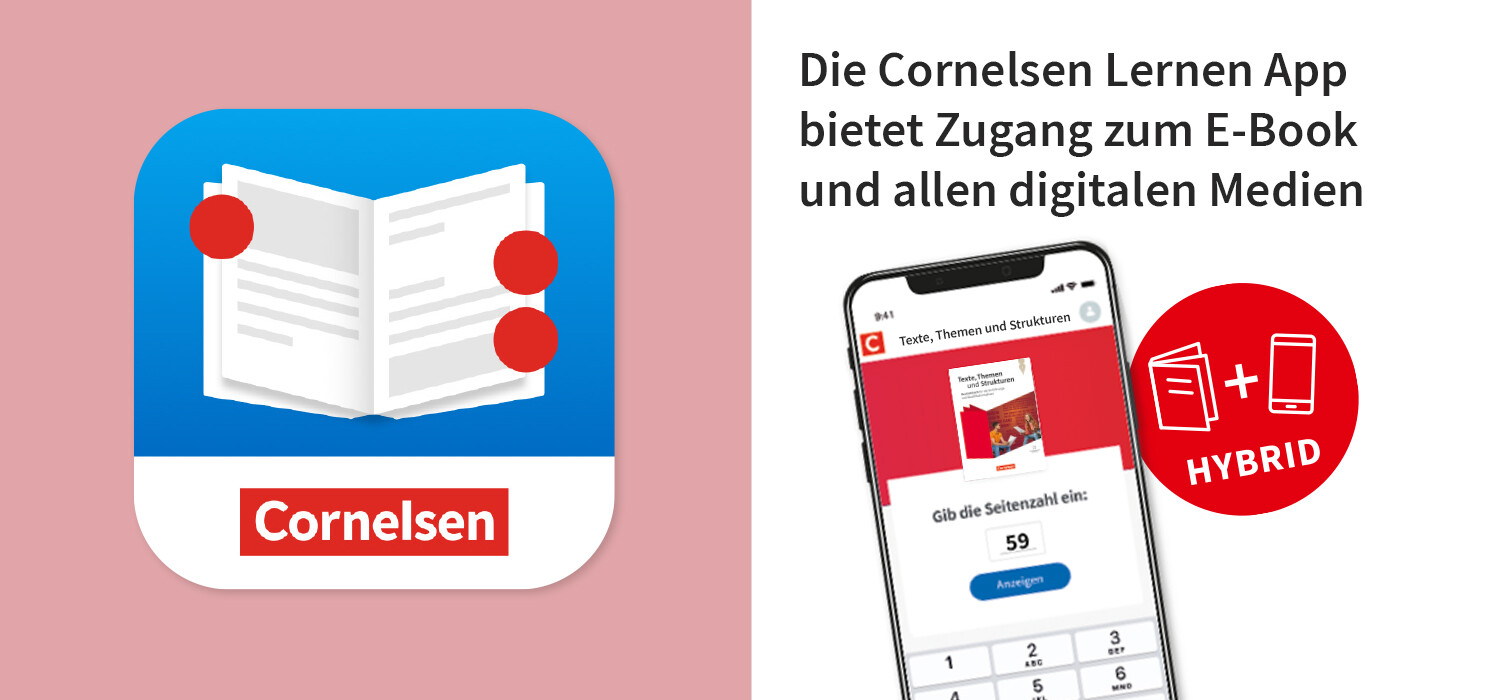 Cornelsen Lernen App: Zugang zu E-Books, digitalen Medien; Hybrid-Modus verfügbar.