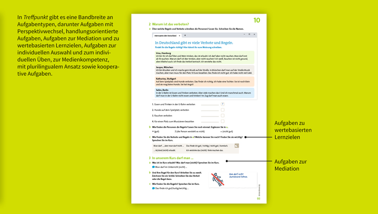 - Fördern Sie mit Treffpunkt außerdem plurilinguale und plurikulturelle Kompetenzen in Ihrem Kursraum und setzen Sie die Grundideen des Begleitbandes des GER optimal und spannend um.