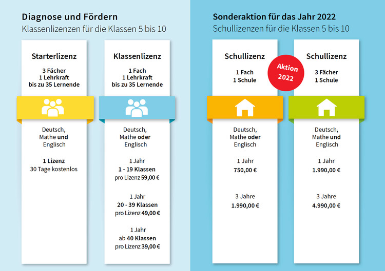 Schulträgern und Medienzentren, die Diagnose und Fördern für mehrere Schulen kaufen möchten, bieten wir attraktive Sonderkonditionen mit erheblichen Rabatten. Für ein individuelles Angebot wenden Sie sich bitte an Ihren Ansprechpartner: